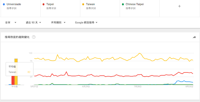 我們來看世大運期間 世大運 (Universiade) 和 臺灣、台北、以及中華台北(真不想承認) 在最近三個月的搜尋熱度比較。